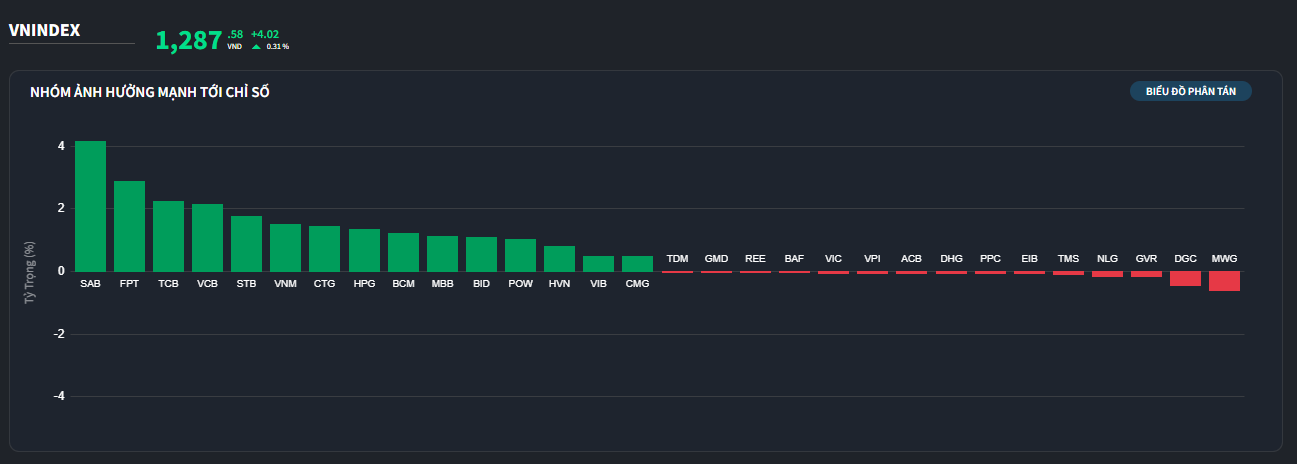 Tuần qua VNINDEX đóng cửa tại 1.287,58 điểm, tăng +25,86 điểm ( hơn 2% so với tuần trước đó). Giá trị giao dịch bình quân phiên (tính trên cả 3 sàn) đạt 25.982 tỷ đồng.