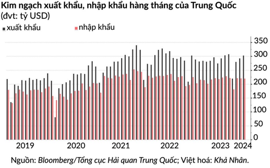 Hình 4: Kim ngạch xuất khẩu, nhập khẩu hàng tháng của Trung Quốc