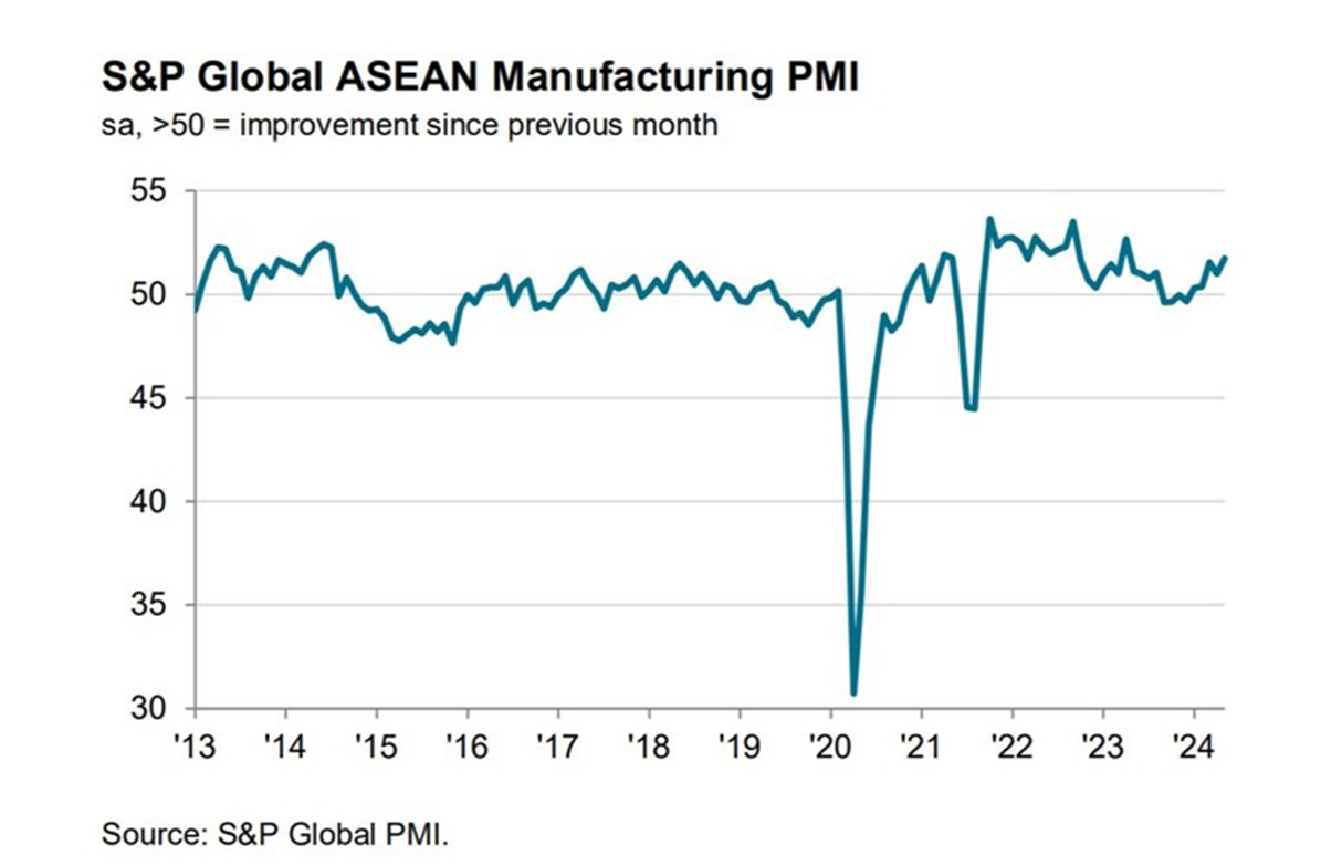 Dữ liệu từ báo cáo của S&P Global kỳ khảo sát tháng 5/2024 cho thấy, các điều kiện kinh doanh của ngành sản xuất ASEAN được cải thiện với tốc độ nhanh nhất trong hơn một năm qua, nhờ sản lượng và số lượng đơn đặt hàng mới tăng. Chỉ số Nhà quản trị Mua hàng (PMI) toàn phần ngành sản xuất ASEAN tháng 5/2024 đạt mức cao nhất trong 13 tháng với 51,7 điểm, tăng so với 51,0 điểm trong tháng 4.